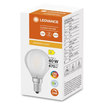Cette ampoule Ledvance Superior Classic LED E14 Boule Dépolie 3.4W 470lm - 940 | Dimmable - Meilleur rendu de couleur est l’alternative idéale pour la remplacement de votre ampoule classique de 40 W. La technologie LED intégrée vous offrira de nombreux avantages. Les ampoules à incandescence traditionnelles ont une durée de vie limitée. Cette alternative LED vous permettra de profiter d’un éclairage durable et fiable.